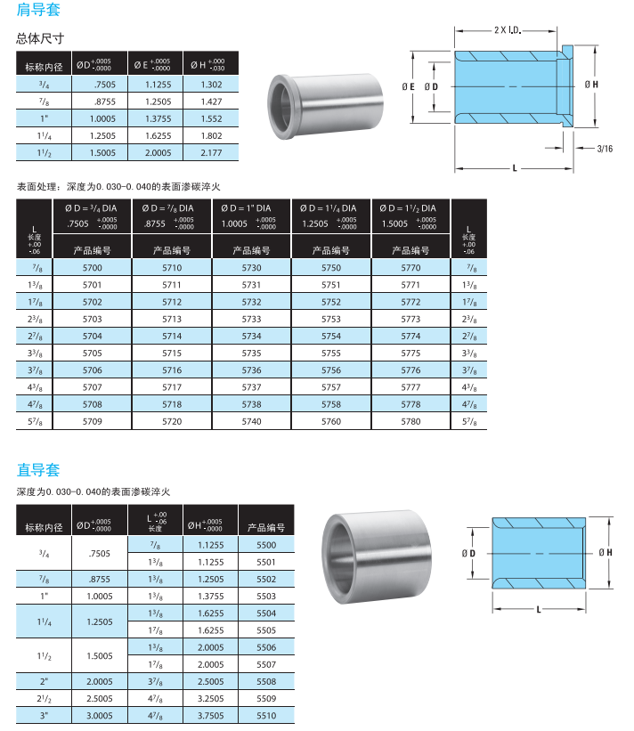 该导套采用优质精密合金钢制作而成。所有导套均经过淬火和精密研磨处理,以减少磨损和延长恶劣制模和碾轧状态下的模具的使用寿命。经过精密打磨,导套内径满足公差要求,并能够确保DME标准岛主的平整度、坚固性和通畅性。
