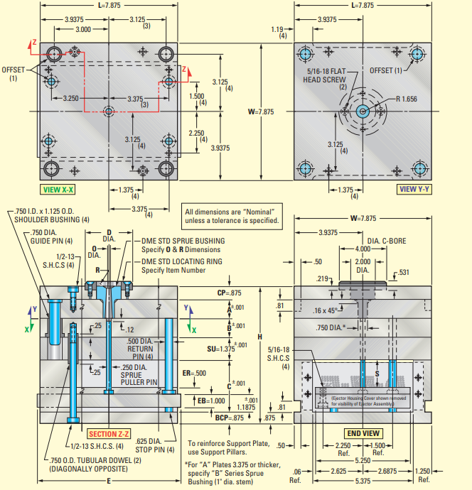 — A系列模架的尺寸从7.875 x 7.875到23.75 x 35.5,共有有43种尺寸。拥有超过75万亿个模具基础配置。