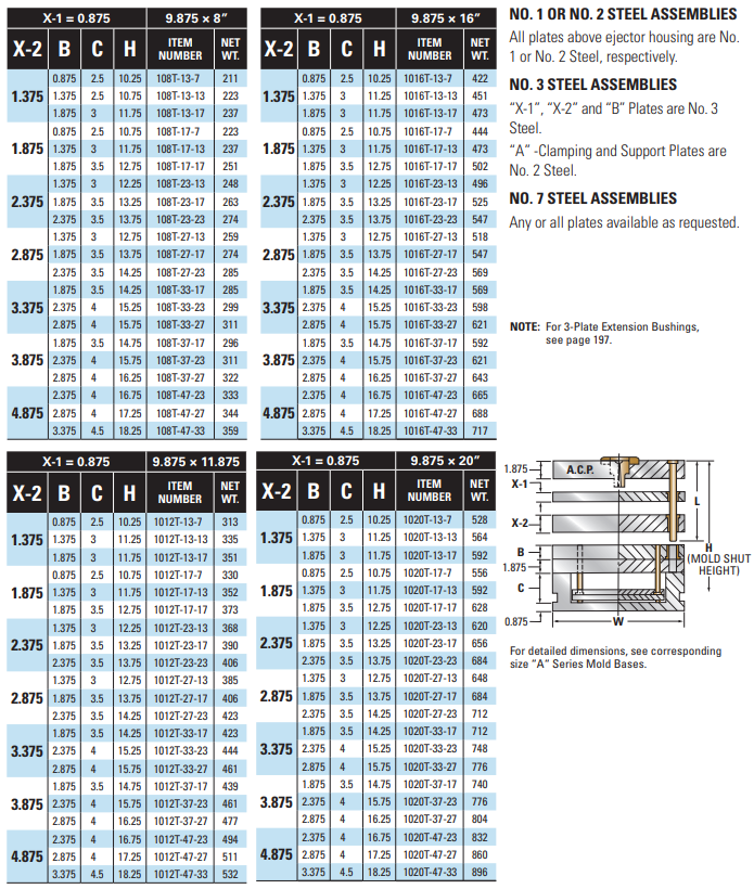 — 从7.875 x 7.875到23.75 x 35.5提供的43种标准尺寸,是为了匹配客户在实际应用中对模具空间的要求。 如果需要其他尺寸也可以进行非标订购。