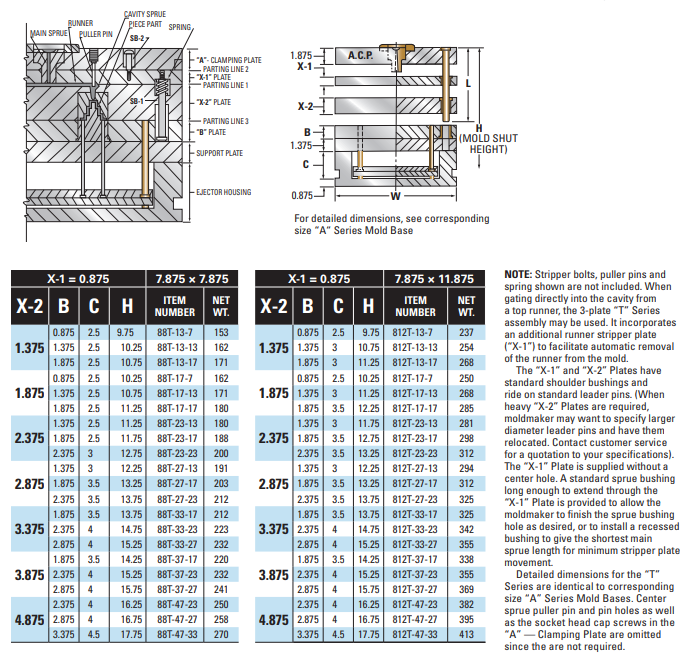 — T系列或三板式模具基座用于需要将零件与工具中流道分开的模具。