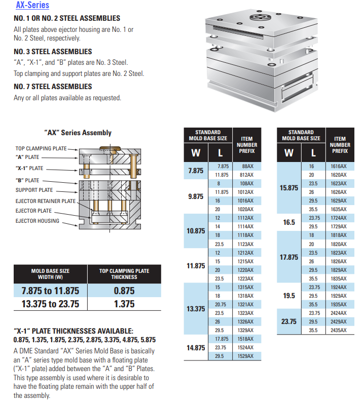 — 模具打开时,将拉动型芯细节,以使零件保留在模具的顶出侧。AX系列本质上是一个带有“ -1”板的A系列模具底座,位于“ A”和“ B”板之间,但与模具的上半部分相连,因此可以将零件从型芯零件上拉下。