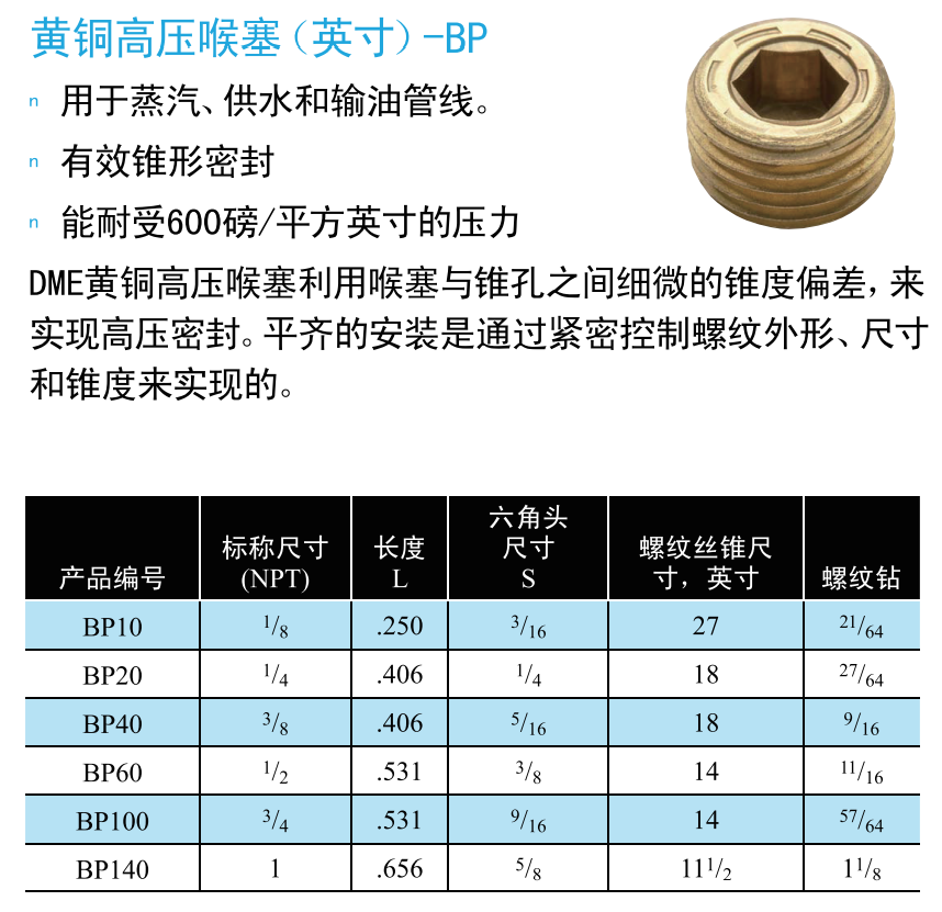 DME黄铜高压喉塞利用喉塞与锥孔之间细微的锥度偏差,来实现高压密封。平齐的安装是通过紧密控制螺纹外形、尺寸和锥度来实现的。 产品特性: — 用于蒸汽、供水和输油管线。 — 有效锥形密封。 — 能耐受600磅/平方英寸的压力。