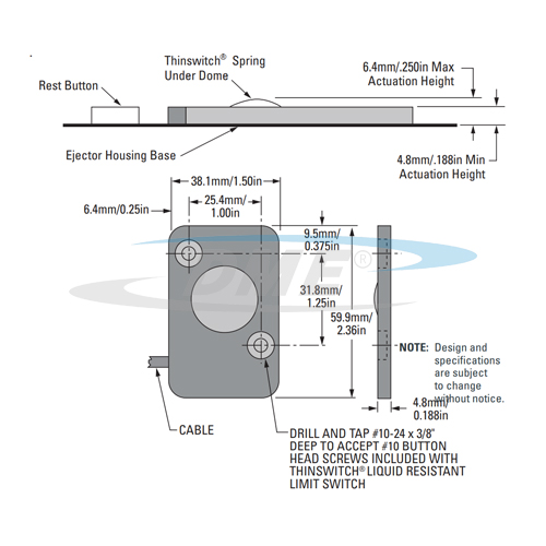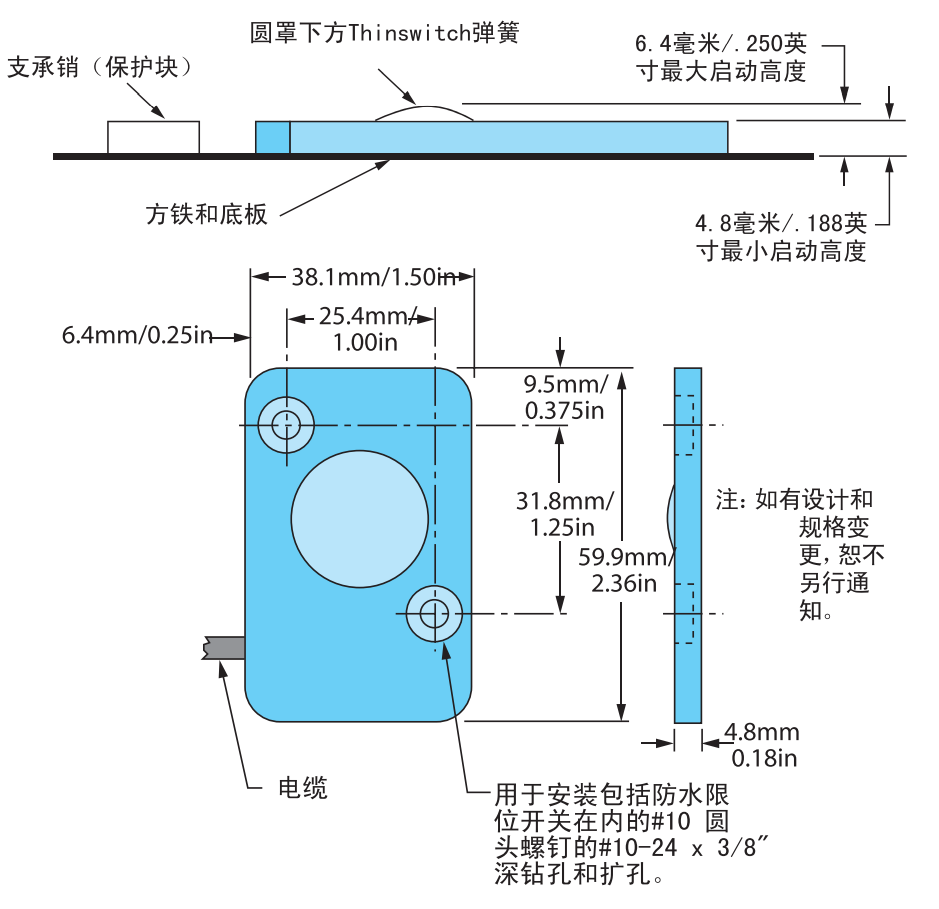 按照设计要求,Thinswitch 防水限位开关用来在偶尔会有水或油污的区域检测顶板的复位情况。Thinswitch限位开关与注塑机的控制装置连接,有助于避免模具在注塑过程中意外闭合。防水限位开关的安装孔位置与原有的Thinswitch相通。经测试,Thinswitch可无故障运行一千万次以上。较大模具可并联安装两只开关,以确保顶板的复位及模具的完好状态。
