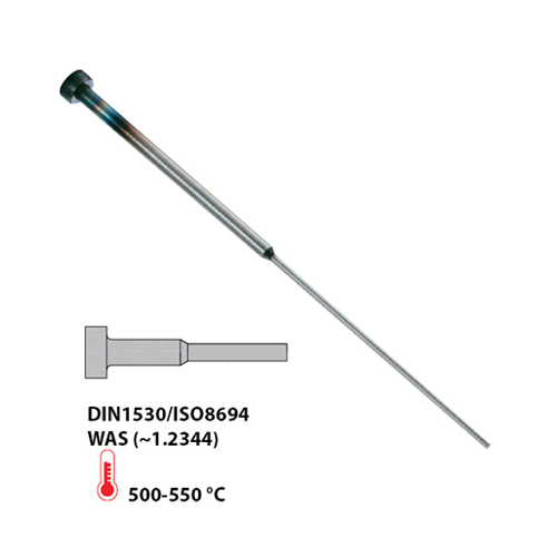 产品优势: — 采用优质H13抗热抗冲击热模锻钢制作而成。 — 热锻顶针头可确保均匀的晶粒流向和高抗拉强度。 — 定芯硬度达40-45HRC。 — 外部经氮化处理,硬度可达65-70HRC,可最大限度减少磨损。 — 经淬火处理的顶针头更加易于加工。 — 经无芯直径D径向研磨。
