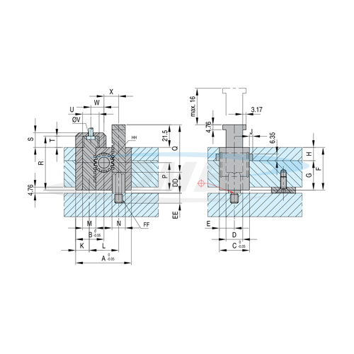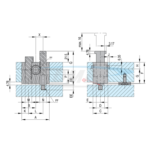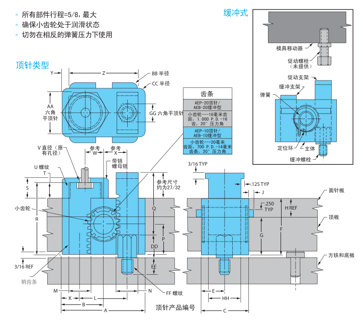 DME快速复位器 — 利用支架和小齿轮机构提供最高位5/8"的额外顶出行程。 — 可借助流利地直线运动来提高顶针、司筒或整个顶出组件的运行速度和距离。 — 组件安装起来十分方便,支架地矩形截面可防止其自转,还有配备地缓冲柱头螺栓能够在顶出组件完全复位的情况下,确保支架地有效复位。