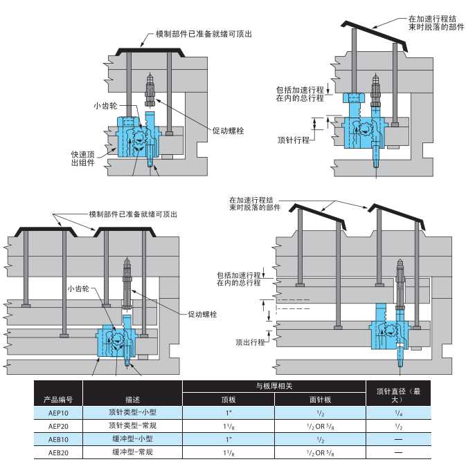 — 可借助流利地直线运动来提高顶针、司筒或整个顶出组件的运行速度和距离。