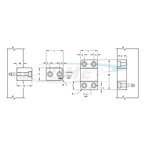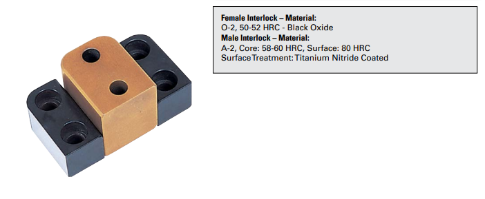 产品优势: DME镀钛边锁具有业内领先的互换性,凭借精密制造和精准公差,每个DME模具边锁部件均可以单独更换,不需拆除整个部件。 DME边锁具有以下特点: — 自动将模具与边锁腔体和芯体对齐。 安装: — 每个模具安装四个边锁(一边一个)。 — 在模具每边的中心线上安装边锁,以消除热膨胀。