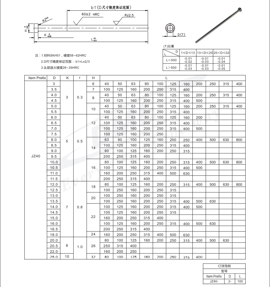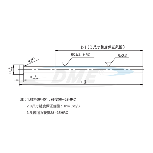 产品特点: 1.材料SKH51,硬度58~62HRC 2.D尺寸精度保证范围:b1≈Lx2/3 3.头部退火硬度28~35HRC